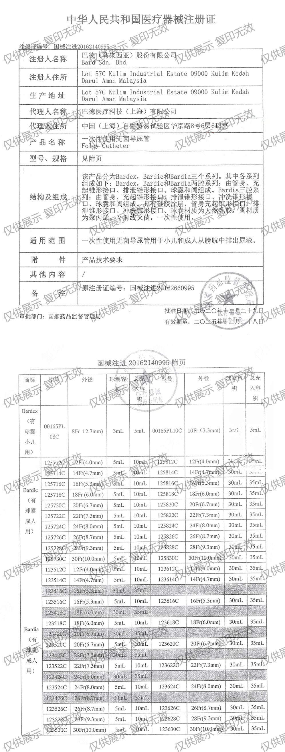 適用范圍:一次性使用無(wú)菌導(dǎo)尿管用于小兒和成人從膀胱中排出尿液。