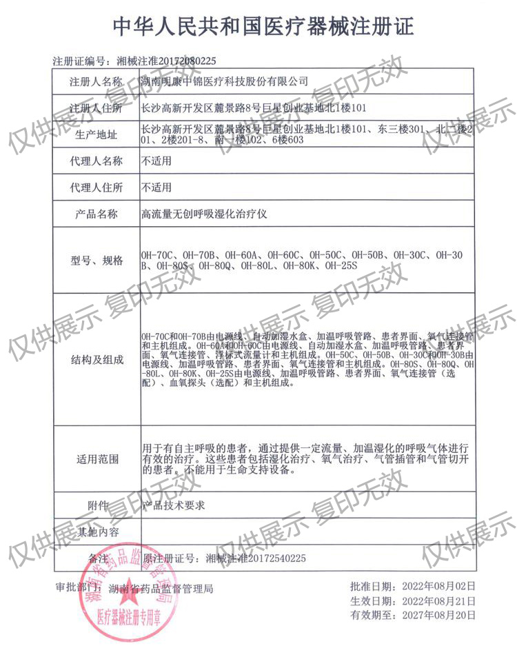 結構及組成:OH-70C和OH-70B由電源線、自動加濕水盒、加溫呼吸管路、患者界面、氧氣連接管和主機組成。OH-60A和OH-60C由電源線、自動加濕水盒、加溫呼吸管路、患者界面、氧氣連接管、浮標式流量計和主機組成。OH-50C、OH-50B、OH-30C和OH-30B由電源線、加溫呼吸管路、患者界面、氧氣連接管和主機組成。OH-80S、OH-80Q、OH-80L、OH-80K、OH-25S由電源線、加溫呼吸管路、患者界面、氧氣連接管(選配)、血氧探頭(選配)和主機組成。
