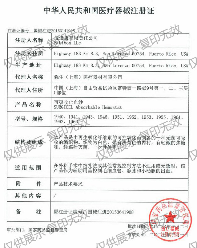 適用范圍:在外科手術中結扎法或其他常規控制方法不適用或無效時,該產品作為輔助用品控制毛細血管、靜脈和小動脈的出血。