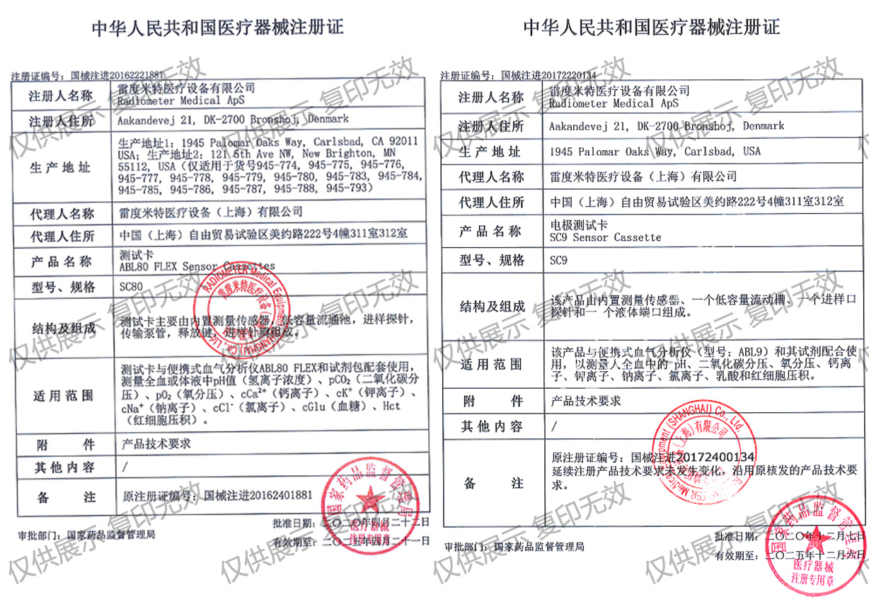 雷度ABL9血氣測試卡注冊證編號:國械注進20172220134