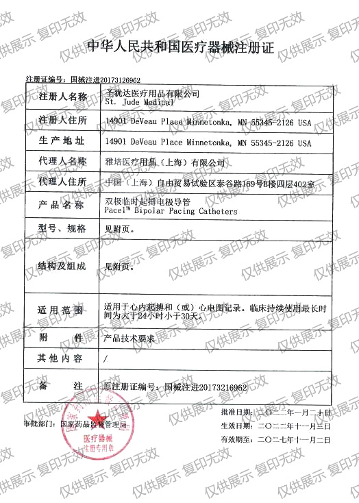 適用范圍:適用于心內起搏和(或)心電圖記錄。臨床持續使用時間為大于24小時小于30天。